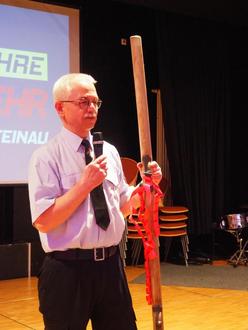 Ortsvorsteher Thomas Vogel präsentierte einen alten Ledereimer, der, zuvor als Schirmständer verwendet, vor langer Zeit einmal einen unverzichtbaren Beitrag zum abwehrenden Brandschutz des Dorfes lieferte. Jason Freeman überreichte die “Hessenkarte” des Landesfeuerwehrverbands, eine Ehrenplakette anlässlich des 100-jährigen Bestehens. Patrick Weber hatte die Plakette des Kreisfeuerwehrverbands im Gepäck, und auch von der Sparkassenversicherung wurde durch Michael Larbig eine Urkunde überreicht. Ein besonderes Geschenk hatte der Steinauer Kamerad Stephan Möller: Die Hebelstange der ersten Handdruckspritze der Feuerwehr aus dem Jahre 1888. Er hat sie über Umwege erhalten und restaurieren lassen, sodass dieses großartige Geschenk, welches,,mit dem Schweiß unserer Vorfahren getränkt ist“ nun im Feuerwehrhaus einen ehrwürdigen Platz erhalten kann. Die Wehrführer der Nachbarwehren Steinhaus und Dammersbach dankten, nachdem sie den Weg über Haune bzw. Roßkuppe auf sich genommen hatten, für die jahrelange Freundschaft.