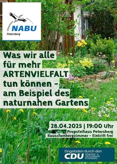 hiermit laden wir Sie recht herzlich zur Veranstaltung mit dem Thema „Artenvielfalt am Beispiel des naturnahen Gartens“ (Flyer beigefügt) ein. Referieren wird der Vorsitzende des NABU Petersberg, Herr Dr. Peschl, welcher u.a. mit seinen praktischen Tipps vielleicht auch Ihre Gartenkünste beeinflussen wird. Wir freuen uns auf Ihr Kommen!