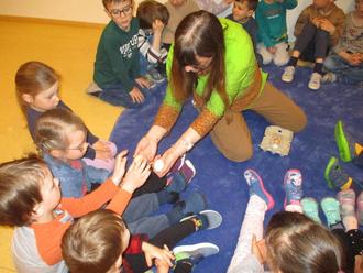 Bereits nach einer Woche wurden die Eier mit einer Schierlampe durchleuchtet. Frau Vogt (Erzieherin aus der Igelgruppe), die das Projekt in der Kita leitete, zeigte den Kindern aller Gruppen sehr eindrucksvoll, wie sich in den Eiern langsam die Küken entwickelten.