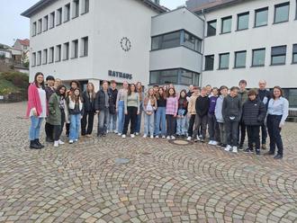 Am Montag, dem 18. März 2024, besuchten die Schülerinnen und Schüler der Konrad-Adenauer-Schule gemeinsam mit ihren Austauschpartnern und Austauschpartnerinnen das Rathaus der Gemeinde. Petersbergs Bürgermeisterin, Claudia Brandes, begrüßte die Jugendlichen sowie deren Lehrkräfte im Rahmen eines offiziellen Empfangs im Rathaus der Gemeinde. Frau Brandes war voll des Lobes für die Aktivitäten der beiden befreundeten Schulen und berichtete ebenfalls von ihren eigenen Erfahrungen als Schülerin.