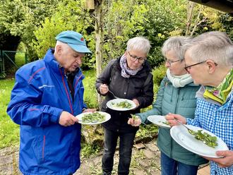 Von tiefen Temperaturen ließen sich weder die 10 interessierten Teilnehmer der Kräuterwanderung noch unser Kräuterexperte abschrecken. Gemeinsam entdeckten wir, wie viele essbare Wildkräuter um uns herum wachsen, was Gutes in ihnen steckt und welch schmackhafter Salat sich aus ihnen zaubern lässt. Von Gänseblümchen, über Labkraut und Sauerampfer bis zum Wiesenschaumkraut - am Ende landeten 19 Wildkräuter in unserem Heilkräutersalat, der mit Kartoffelstückchen und gekochtem Ei angemacht (gegen die Bitternis) gemeinsam verkostet wurde. Lecker!