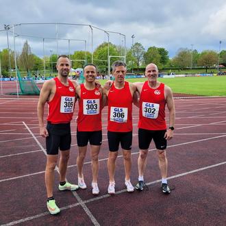 Mit dabei der Steinauer Nils Milde (Dritter von links), der für seinen Verein (ASC Darmstadt) sowohl in der 4x400m Staffel als auch über die 3x1000m Distanz in der Altersklasse M40/45 an den Start ging.