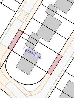 Familie Schulz besitzt ein Grundstück, das an zwei zum Teil parallel verlaufene Straßen angrenzt. Beide Straßen haben beidseitige Gehwege.