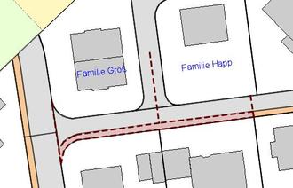 Die Familien Groß und Happ besitzen jeweils ein Eckgrundstück an einer Straße mit einseitigem Gehweg.