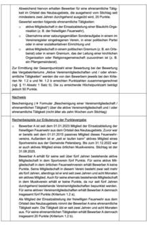 | 2. | das Formular „Bescheinigung einer aktiven Vereinsmitgliedschaft und / oder ehrenamtlichen Tätigkeit“) als Nachweis für das Vergabekriterium „Aktive Vereinsmitgliedschaften und / oder ehrenamtliche Tätigkeiten“ (vgl. Kriterium Nr. 1.2 in der Anlage) und |