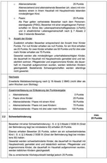 | (1) | Zur Bildung einer Rangliste der nach § 9 Absatz 1 zugelassenen Bewerbungen werden diese anhand der in der Anlage genannten Vergabekriterien mit Punkten bewertet. Hierbei wird bei einer Bewerbung mit zwei Bewerbern jeder Bewerber bei jedem Kriterium einzeln bepunktet. Eine Anhäufung der jeweils erreichten Punktzahlen erfolgt nicht. Zur Berechnung der Gesamtpunktzahl einer Bewerbung werden die bei jedem Kriterium jeweils erreichten höheren Einzelpunktzahlen zusammengerechnet. Eine Anhäufung der von beiden Bewerbern erreichten Einzelpunktzahlen ist nur bei einzelnen ausdrücklich in der Anlage genannten Vergabekriterien zulässig. |
