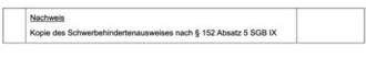 | 3. | die Kopie des Schwerbehindertenausweises nach § 152 Absatz 5 Sozialgesetzbuch IX (SGB IX) als Nachweis für das Vergabekriterium „Schwerbehinderung“ (vgl. Kriterium Nr. 2.2 in der Anlage). |