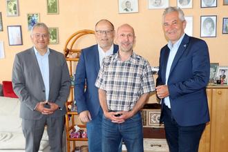 Für die Vorstandsmitglieder des Musikvereins Petersberg und Bürgermeister Carsten Froß war es eine besondere Ehre, Werner Schmitt persönlich zum 60. Geburtstag zu gratulieren. Der Hobbymusiker ist seit 41 Jahren der 1. Vorsitzende des Musikvereins Peterberg. „Über eine solch lange Zeit die Verantwortung zu übernehmen, ist nicht alltäglich und etwas ganz Besonderes“, stellte Bürgermeister Carsten Froß fest, der auch als Saxophonist Mitglied des Vereins ist. Er lobte das ehrenamtliche Engagement Schmitts und sein erfolgreiches Wirken. „Du bist für deine Beständigkeit ein großes Vorbild“, so der Petersberger Bürgermeister weiter, der damit auf die Wichtigkeit der Vereinsarbeit hinwies.