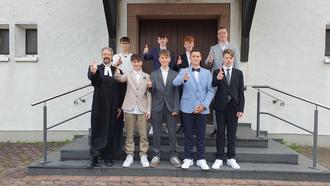 | Wir gratulieren herzlich unseren frisch Konfirmierten. In der St. Johanneskirche wurden am Pfingstsonntag 15 Jugendliche in 2 Gottesdiensten von Pfarrer Christian Pfeifer eingesegnet: Mira Bohn, Lenja Herzig, Emily Maul, Alexander Paluschin, Ben Rasper, Helena Sauer, Lina Thiel Noah Chalupa, Seán Fischer, Nils Gerbig, Lorenz Pankratz, Emil Popp, Jonas Raab, Marvin Szentarra, Bastian Vogt | ||