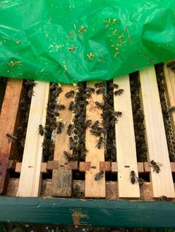 Dort angekommen, flogen uns schnell sehr viele Bienen entgegen, als wir den Deckel des Bienenstocks öffneten. Als Herr Rieser uns allen die Waben zeigte, stach ihn eine Biene.