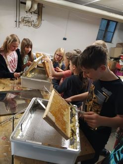 Am Dienstag, dem 6.6.2023 fand unser letzter Bienenprojekttag mit Herrn Rieser statt. In der 2. Unterrichtsstunde sind wir zu den Bienenstöcken gegangen. Dort angekommen, hoben wir den Deckel des Bienenstocks an und kehrten mit einem speziellen Besen die Bienen von den Rähmchen ab. Nun haben manche Kinder aus unserer Klasse die Rähmchen in eine Kiste getan. Als alles verstaut war, gingen wir zu Schule in den Werkraum. Anschließend erklärte uns Herr Rieser, dass man die Verdeckelungen von den Honigwaben auskauen kann.