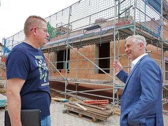 Zusätzlich zur Atemschutzwerkstatt entsteht eine Kleiderkammer, mit der die Bekleidung der Feuerwehrleute künftig zentral gelagert werden kann. Insgesamt sind für die Baukosten 1,2 Millionen Euro veranschlagt. „Das ist eine Menge Geld, aber das ist gut investiert. Denn schließlich bauen wir hier keinen Protzpalast, sondern ein Funktionsgebäude, das die Leistungsfähigkeit unserer Freiwilligen Feuerwehr dauerhaft sichert“, erklärt Bürgermeister Carsten Froß, der die Baustelle vor Kurzem mit Michael Streitenberger vom Fachbereich Bauen & Wohnen besichtigt hat.