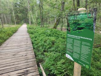 Auf dem Hochmoorkörper wurden im vergangenen Jahr die Mönche vollständig rückgebaut die Abläufe und Entwässerungsgräben verschlossen. Zudem wurden die maroden Holzspundwände saniert. Über 140 überwiegend ehrenamtliche Teilnehmende waren im Sommer 2023 acht Wochen lang im Einsatz, bewegten sich in den sensiblen Bereichen des Hochmoors auf Bohlenwegen und setzten verschiedenste Arbeiten per Hand um.