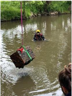 Die Bergung am Folgetag mit Hilfe des Kranwagens des Abwasserverbandes brachte eine besondere Überraschung: der „magnetische Stein“ war ein aufgebrochener Tresor.