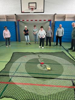 Bea Schütz, Trainerin des Turnverein Petersberg im Seniorenbereich, gehört auch zum Petersberger Prüfungsteam. Sie hat die ersten Sportabzeichenübungen - hier Zielwerfen - in ihre Trainingsstunden eingebaut und bereitet ihre Gruppe step by step auf die Prüfungen vor.