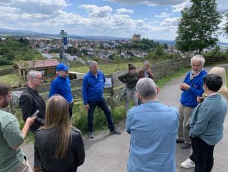 Einen echten Aha-Moment erlebten die Gäste bei einer Exkursion mit dem Nabu-Ortsverband Petersberg. Der Verein betreut Ausgleichsflächen für die Gemeinde. In Deutschland ist es Gesetz, Ausgleichsflächen zu schaffen, wenn der Natur etwa bei Bauprojekten Fläche „weggenommen“ wird. Als die Kita Rauschenberg gebaut wurde, wurde dafür an einem anderen Hang des Rauschenbergs eine Ausgleichsfläche geschaffen. Dieses Areal war vor zehn Jahren komplett verbuscht, die Artenvielfalt gering. Der Nabu bekämpft diese Verbuschung mit einer Ziegenherde: Die Tiere fressen die Büsche und halten sie somit klein - eine Arbeit, die sowohl für Mensch als auch Maschine viel zu aufwendig wäre. Bei einer zweiten Ausgleichsfläche am Schuhhof erklärten die Nabu-Mitglieder Dr. Alfred Peschl, Michael Heinz und Martin Neugebauer, warum auch Totholzhaufen wertvoll für die Biodiversität sein können. „So etwas müsste es auch bei uns in Frankreich geben“, sagte Christine Ferrer, Beigeordnete aus Billère.
