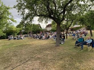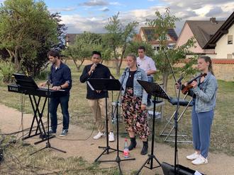 Gelungene Premiere: Bei ihrem ersten Auftritt hat die Band Glückwärts mehr als 100 Besucherinnen und Besucher in den Propsteigarten Petersberg gelockt. Das Quartett begeisterte mit Lobpreis-Liedern und selbstkomponierten Songs - und einem Überraschungsgast.