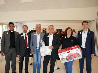 von links: Pfarrer Togar Pasaribu, Pfarrer Christian Pfeifer, Kreisbeigeordneter Hermann Müller, Bürgermeister Carsten Froß, Kita-Leiterin Ina Plachtzuk und Landtagsabgeordneter Sebastian Müller.