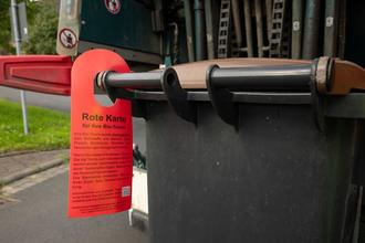 Bio-Tonnen die wegen einer Roten Karte nicht geleert wurden, können ausnahmsweise im Rahmen der Restmüllabfuhr mit geleert werden. Hierfür muss eine spezielle gebührenpflichtige Banderole bei der örtlich zuständigen Stadt- oder Gemeindeverwaltung gekauft werden. Die Banderole ist an der Griffleiste der Bio-Tonne gut sichtbar anzubringen. Die Tonne darf dann bei der nächsten Restmüllabfuhr bereitgestellt werden und wird als Restabfall geleert. Die Gebühr für die Banderolen beträgt für eine 120-Liter-Bio-Tonne 20 Euro und für eine 240-Liter-Bio-Tonne 25 Euro. Zukünftig wird auch hier genauer geprüft, wie oft eine Leerung der Bio-Tonne im Rahmen der Restmüllabfuhr erfolgte. Bei häufiger Nutzung dieser Ausnahme durch einen Grundstückseigentümer wird ein Ordnungswidrigkeitenverfahren eingeleitet, da die Bürgerinnen und Bürger gesetzlich zur getrennten Sammlung ihres Abfalls verpflichtet sind.