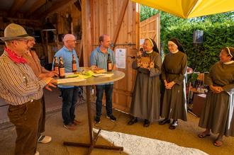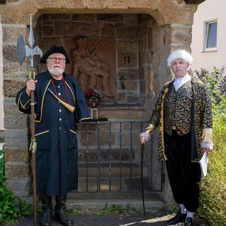 Ein besonderes Highlight war die historische Wanderung durch den Ort, bei dem Peter Scheel als Propst Sigismund von Bibra und Felix Gaul als Turmwächter auftraten. Nach dem Start an der alten Friedhofskapelle St. Bonifatius ging es bei der Wanderung zum neugestalteten Propsteigarten bis zur Orangerie unterhalb der Liobakirche. Als kleines Dankeschön erhielten die Liobaschwestern am Backhausfest ein Modell der Liobakirche als Präsent. Dieses Modell kann exklusiv nur durch Mitglieder des Heimatvereins beim Vorstandsmitglied Michael Kircher erworben werden.