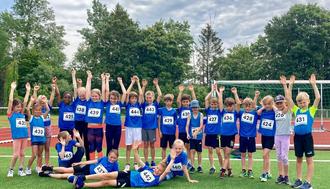 Im Hünfelder Stadion „Rhönkampfbahn“: Petersberger U10er und U12er: Stehend von l.: Ema Mavriqi, Charlotte Polny, Lea Schneider, Halifa Tchadenou, Mariella Pieper, Ronja Röder, Jette Schäfer, Jakob Goldbach, Luis Aschenbrücker-Fladung, Stian Rübsamen, Erik Holguin Schulz, Bastian Goldbach, Laurenz Schmitt, Qays Alazmeh, Erik Wolfram, Lotta Atzert, Julia Doronin, Lennart Habersack; vorne von l.: Mira Bohn, Clara Döring, Simon Aschenbrenner und Rosa Happ