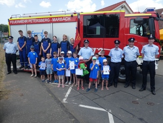 Um 14 Uhr startete der zweite Festakt des Tages mit der offiziellen Gründung der Kinderfeuerwehr für Kinder im Alter zwischen 6 und 10 Jahren. Zu diesem konnte Wehrführer Max Baumgartl vom Kreisfeuerwehrverband Bernward Münkel-Breidung begrüßen. Dieser freute sich, die Gründung der 5. Kinderfeuerwehr in der Gemeinde Petersberg mit bereits 16 Gründungsmitgliedern vernehmen zu können. Als Gründungsgeschenk brachte unter anderem ein gemeinsames Maskottchen für die Kinder mit - den Drachen Grisu.