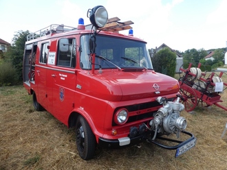 Im Vordergrund: der restaurierte Opel Blitz, im Hintergrund ein historischer Schlauchwagen
