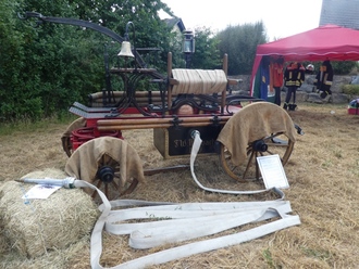 Im Vordergrund: die historische Handdruckspritze, im Hintergrund eine Ausstellung der Historik-AG