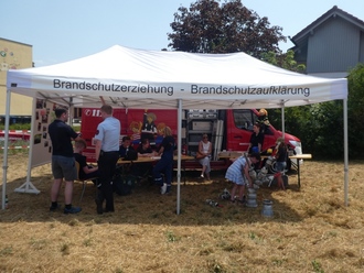 Die Jugendfeuerwehr präsentierte sich mit einem eigenen Infostand und konnten unter anderem mit einem Modellhaus die Belüftung von verrauchten Räumen bei einem Gebäudebrand mit feuertechnischem Gerät erläutern.