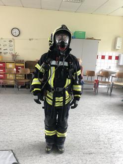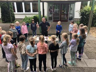 Am Freitag, 05. Juli, war es in diesem Schuljahr wieder so weit. Frau Heil, Herr Diegelmann, Herr Eckard und Herr Fischer kamen mit einem Feuerwehrauto und in Uniform zu uns an die Schule. Die Klassen 2a und 2b wurden in zwei Gruppen eingeteilt. Bei Herrn Eckard und Herr Fischer erfuhren die Kinder, was ein Feuerwehrmann bei einem Einsatz zum einen für Kleidung anziehen muss und welche Hilfsmittel er mit sich führen muss. Die schwere Feuerwehrjacke gehören ebenso wie die Atemschutzmaske zur unverzichtbaren Ausrüstung eines Feuerwehrmannes bzw. einer Feuerwehrfrau. Anschließend wurden draußen auf dem Schulhof Versuche über die Brennbarkeit von verschiedenen Materialien durchgeführt. So konnten die Schülerinnen und Schüler direkt miterleben, dass beispielsweise ein Kuscheltier schnell brennt, während die Barbiepuppe zwar Feuer fängt, aber unmittelbar nach Beendigung der Flammenbestrahlung auch wieder aufhört weiter zu brennen.