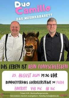 In "Das Leben ist kein Ponyschlecken" widmen sie sich der Frage, wie man in einem chaotischen Alltag die Orientierung behält - und warum es manchmal besser ist, aufzusteigen und loszureiten, statt zu jammern. Wer Lust auf einen Abend mit Haltung, Humor und Horizont hat, sollte sich diesen Auftritt nicht entgehen lassen. Tickets bei simone.moehring@ekkw.de und im Servicebüro herzlich evangelisch sowie in der Bonhoeffergemeinde.