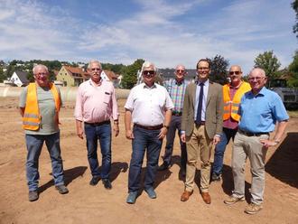 Ortstermin an der Großbaustelle des Abwasserverbands Fulda (AVF): Am Mittwoch, 3. August, informierten sich der Verbandsvorsitzende des AVF, Stadtbaurat Daniel Schreiner, und die Vorstandsmitglieder Timo Zentgraf und Gerhard Stollberg über den Baufortschritt der Baumaßnahme Regenüberlaufbecken „An den Höfen“ in Fulda-Horas. Dort investiert der AVF kräftig in den Gewässerschutz. Für die Gemeinde Petersberg nahm in Vertretung für Bürgermeister Carsten Froß der Erste Beigeordnete Hartwig Blum teil.