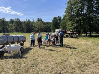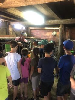 Landwirt Baier erklärt den Ferienspielkindern Abläufe auf seinem Bauernhof.