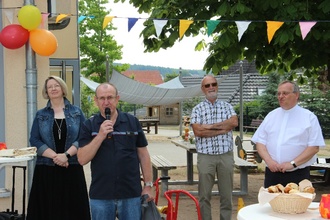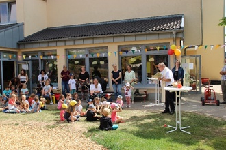 Frau Fladung bedankte sich im Namen der Kinder und Erzieherinnen beim Beigeordneten Winfried Schäfer, der in Vertretung des Bürgermeisters erschienen war, für die Investition von rund 39.000 €. Dadurch war es möglich, den baufälligen Rutschturm durch eine großzügige Spielanlage zu ersetzen und auch den Garten neu zu gestalten. Außerdem wurde ein größeres und wetterfestes Gerätehaus gebaut, in dem sich ausreichend Platz für alle Fahrzeuge und Spielsachen findet.