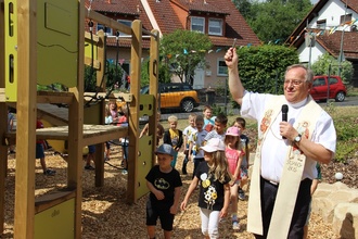 Die bereits seit einigen Jahren geplante Umgestaltung konnte im November 2021 endlich begonnen und im Frühjahr 2022 abgeschlossen werden. Herr Pfarrer Rudolf Liebig, der in Vertretung des erkrankten Pfarrers Thomas Witzel die Segnung der Spielanlage vornahm, zeigte sich ebenso begeistert von dem umgestalteten Gelände wie die Vertreterinnen des Elternbeirats Nadja Moalem und Leonie Schwab und der stellvertretende Vorsitzende des Verwaltungsrats Othmar Bleuel.