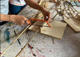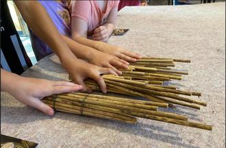 Nach der Einführung in das Thema Insekten, bei der die Kinder erfuhren, dass Insekten sechs und Spinnen acht Beine haben, ging es an die Arbeit mit den Schilfhalmen. Dabei stießen die Kinder auf ein erstes Aha-Erlebnis: Viele von ihnen hielten die Schilfhalme für Bambus. Dieser Irrtum zeigte auf, wie wenig vertraut die Kinder mit der heimischen Pflanzenwelt sind.