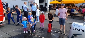 Gegen 13.30 Uhr rückten die Kinderfeuerwehrwarte Benjamin Winkler und Fabian Fröhlig die Kinder der Kinderfeuerwehr in den Mittelpunkt des Festbetriebs. Nach einem kurzen Grußwort der Bürgermeisterin Claudia Brandes und für den Kreisfeuerwehrverband Dirk Wächtersbach wurde den Kindern das zuvor erworbene Tatze-Abzeichen überreicht.