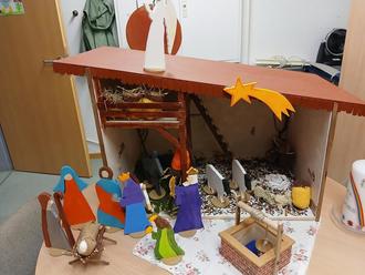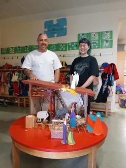 Die pädagogischen Mitarbeiter des Kurses IREA (Individuelle Reintegration ins Arbeitsleben für Menschen mit psychischen Erkrankungen) brachten eine selbstgebaute Krippe in die Kita und sorgten damit für Staunen und strahlende Kinderaugen.