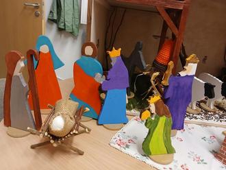 Das Team der Kita hatte den Bau einer neuen Weihnachtskrippe vor einiger Zeit beim BBZ in Auftrag gegeben. Über einen Zeitraum von einem halben Jahr haben sich die Kursteilnehmer wöchentlich getroffen, um das Projekt umzusetzen. Wir haben ihnen dabei viel kreativen Spielraum gelassen, sodass sie ihre unterschiedlichen Fähigkeiten nutzen und eine bunte und detailreich gestaltete Krippe erschaffen konnten.