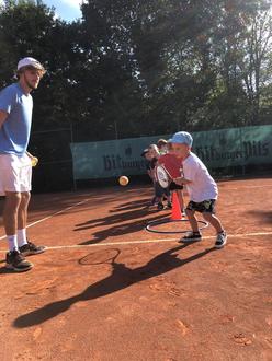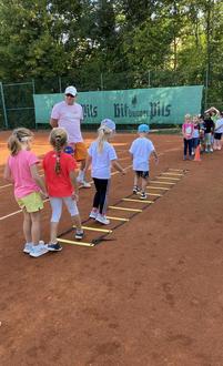 Als wir am Tennishäusschen ankamen, begrüßte uns Ulla erst einmal mit einem Eis. Das war schon spitze. Beim Eisessen konnten wir schon den Spielern und Spielerinnen auf dem Platz zusehen, was die Aufregung steigen ließ. Schon kam auch Andrei, der Trainer, und hieß uns auf der Anlage herzlich willkommen. Max stand uns ebenfalls noch als Trainer zur Verfügung. Dann ging es auch schon los. Zuerst machten wir uns ordentlich warm. Anschließend kamen Übungen zur Koordination, Kraft, Ausdauer und Schnelligkeit. Auch der Umgang mit Schläger und Ball wurden bestens geschult.