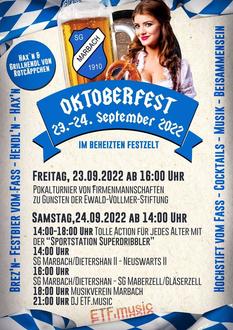 Nach langer Coronapause möchten wir alle Mitglieder, Freunde und Bekannte der SG Marbach herzlich zum geselligen Oktoberfest am Freitag, 23.09.2022 und Samstag, 24.09.2022 am Sportgelände um das „Waldstadion“ in Marbach einladen.