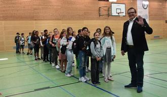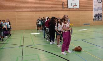 Am Ende der von Mario Happ vorbereiteten und moderierten Veranstaltung versammelten die neuen Klassenlehrerinnen und Klassenlehrer Dennis Werthmüller, Jens Plur, Jan-Niklas Höpfner, Thomas Noell und Melanie Krenzer (zum Teil an diesem Tag vertreten) ihre neuen Schülerinnen und Schüler um sich und alle gingen - zum Teil mit klopfenden Herzen - in die neuen Klassenräume.