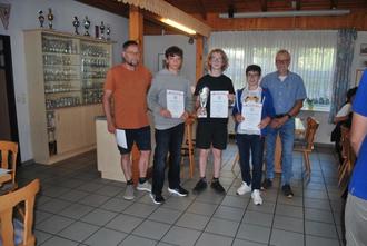 Die Siegerehrung wurde dann im Anschluss im Vereinsheim des TV Petersberg vorgenommen, zu welcher auch die Eltern eingeladen waren. Aus den Händen des Abteilungs- und Jugendleiter erhielten die erfolgreichen Spieler ihre Urkunden und Jakob Strube die beiden Wanderpokale. Allen Teilnehmern wurde für ihre gezeigten Leistungen gedankt. Der Abend klang mit einem Pizzaessen und kühlen Getränken aus.