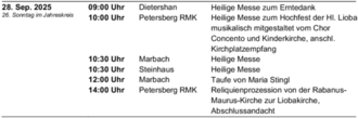 | Petersberg RMK | 10:00 Uhr | Heilige Messe zum Hochfest der Hl. Lioba musikalisch mitgestaltet vom Chor Concento und Kinderkirche, anschl. Kirchplatzempfang |