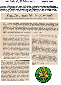 Am 8. und 9. September 1973 feierte der Rhönklub- Zweigverein Petersberg sein 25jähriges Bestehen. Im August diesen Jahres wurden 75 Jahre gefeiert. Und noch immer ist der Rhönklub Zweigverein eine feste Größe in unserem Heimatort. Danke allen die sich engagieren und die Wandertradition am Leben erhalten. Hier einige Ausschnitte aus dem Bericht der FZ von 1973