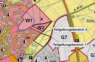 Der Teilgeltungsbereich 2 mit einer Fläche von ca. 1,45 ha befindet sich nördlich des Teilgeltungsbereiches 1, die nördliche Begrenzung bildet die Margretenhauner Straße. Der Teilgeltungsbereich 2 dient der Rücknahme einer dargestellten Wohnbaufläche, zu Gunsten der Neuausweisung der Wohnbaufläche im Teilgeltungsbereich 1. Die Lage und Abgrenzung der beiden Planänderungsgebiete ist in der nachstehenden Abbildung dargestellt.