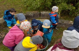 Ein weiteres Highlight war die eigene Apfelernte auf dem Kindergartengelände. Fleißig und im Handumdrehen haben unsere Kindergartenkinder Eimer voll mit leckeren Äpfeln gesammelt.