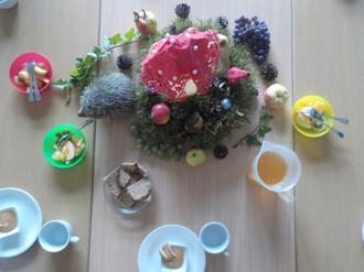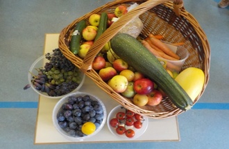 Diese beiden Erntegaben, Kartoffel und Äpfel, wurden mit den Kindern zusammen weiterverarbeitet. So gab es beim gemeinsamen Erntedankfest Reibekuchen und Apfelbrei. Schön war auch in dieser Zeit unser Erntekorb am Eingang. Durch die mitgebrachten Gaben hatten die Kinder eine große Auswahl von Obst und Gemüse gehabt. Frau Dechant, die Geindereferentin aus Steinhaus, hat mit den zukünftigen Schulkindern eine kleine Erntedankeineit gestaltet und dafür einiges an Obst und Gemüse aus ihrem Garten zum Anschauen mitgebracht.