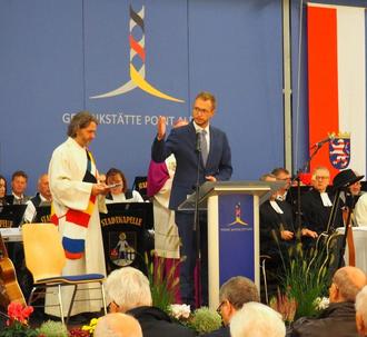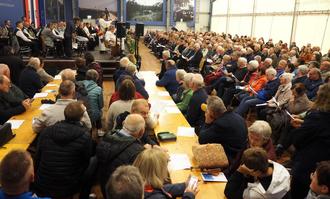 Rasdorf/Geisa. Der 3. Oktober ist der wichtigste Feiertag in Deutschland, weil er an ein großartiges Ereignis erinnert: die Wiedervereinigung. „Bei der Friedlichen Revolution haben viele Menschen auf den Psalm ‚Zukunft hat der Mensch des Friedens‘ vertraut und sie wurden nicht enttäuscht“, hob Dr. Ulrich Neymeyr am „Tag der Deutschen Einheit“ hervor. „Wir sind voller Dankbarkeit, dass eine Diktatur ohne Blutvergießen gestürzt wurde und das eine Grenze ohne Krieg verschwunden ist“. Die Festpredigt des Bischofs aus dem Bistum Erfurt beim Ökumenischen Gottesdienst in die Fahrzeughalle des US Camps der Gedenkstätte Point Alpha verfolgten rund 500 Besucher.