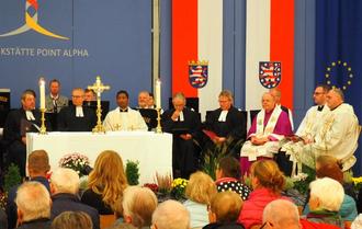 An seiner Seite hatte Neymeyr als Konzelebranten Superintendent Christoph Ernst (Ev.-luth. Kirchenkreis Bad Salzungen-Dermbach), Pastor Dr. Jürgen Kämpf (Stv. Dechant Dekanat Hünfeld-Geisa), Dekan Dr. Thorsten Waap (Ev. Kirchenkreises Fulda), Pfarrer Roland Jourdan (Ev. Kirche Vacha und Geisa), Pfarrer Harald Krüger (Ev. Kirche Hohenroda) sowie Pfarrer Ulrich Piesche (Kath. Kirche Eiterfeld). Für die Lesung war die Point-Alpha-Mitarbeiterin Katrin Werth zuständig. Zur musikalischen Umrahmung griffen die Stadtkapelle Geisa unter der Leitung von Stephan Nimmich sowie Diakon Dr. Meins G.S. Coetsier mit seiner Band "Divine Concern" zu den Instrumenten.